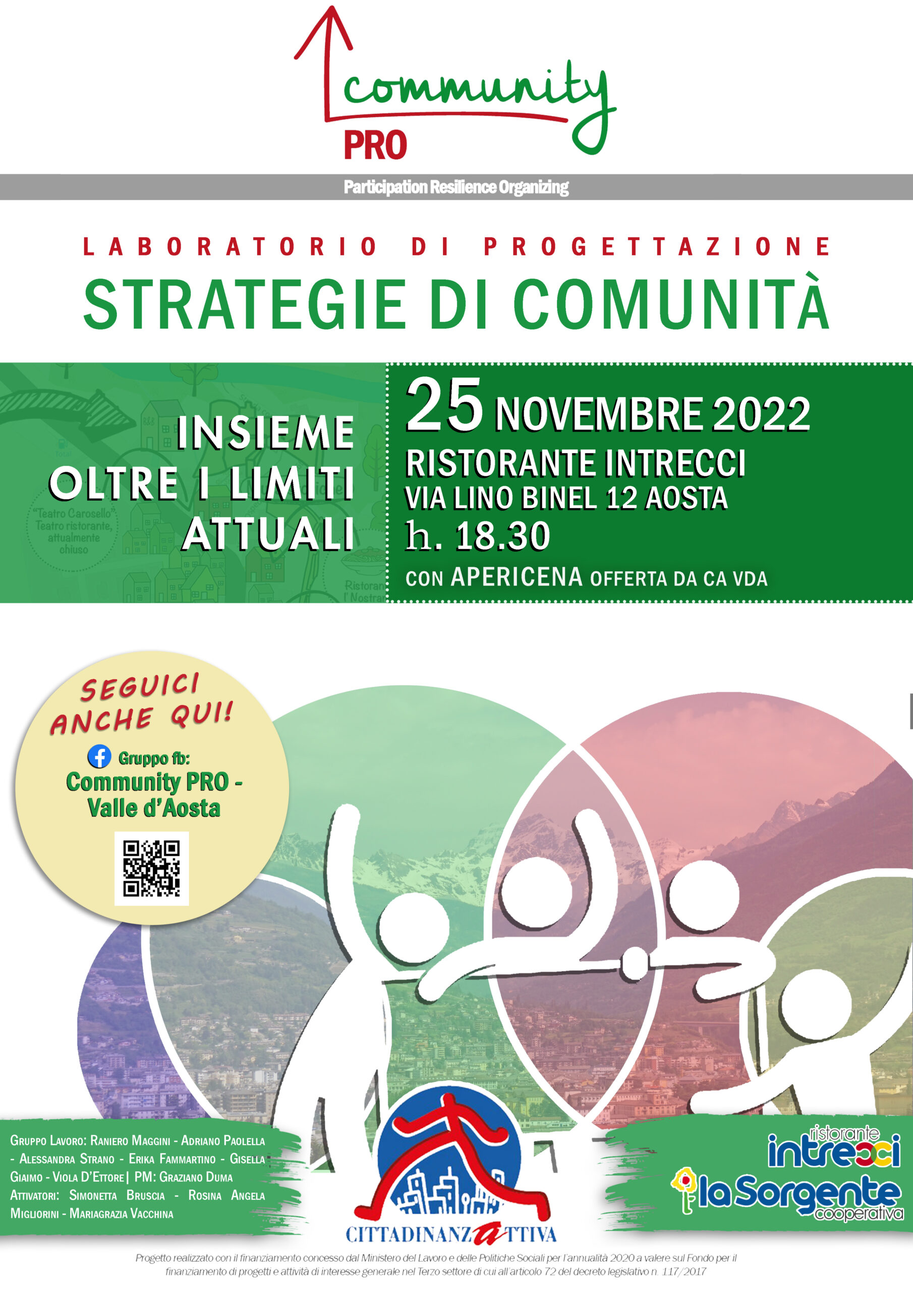 Un secondo incontro, dopo quello del 20 agosto, per illustrare fini e azioni di Community pro è organizzato da Cittadinanzatttiva VdA venerdì 25 novembre, dalle ore 18,30 al ristorante Intrecci ad Aosta in via Binel 12. Mariagrazia Vacchina, presidente di Cittadinanzattiva VDA auspica un evento “affollato e partecipato come il primo”.